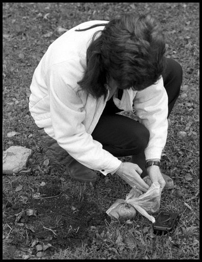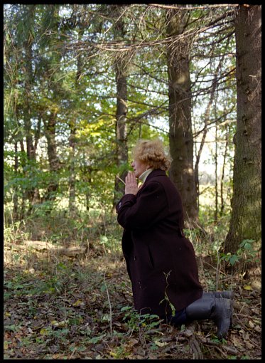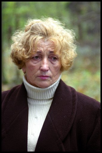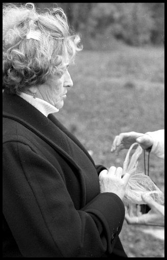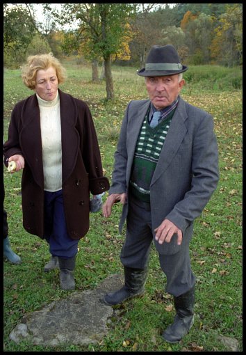 kilka garści rodzinnej ziemi, klęczą na resztkach cmentarza, na