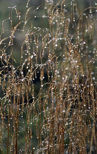 Po nocnej mgle na trawach pojawiła się perlista rosa.
